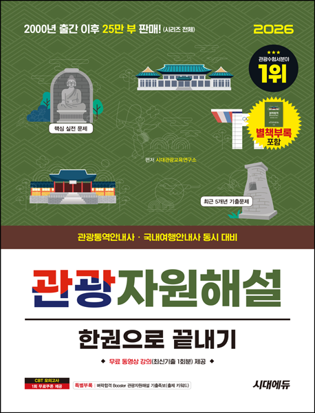 시대에듀의 〈관광통역안내사〉는 2000년 첫 출간 이후 25만 부 이상 판매된 베스트이자 스테디셀러입니다. 오랜 시간 축적된 시대에듀만의 노하우를 바탕으로 우리 문화와 세계를 잇는 역할을 함과 동시에 나라의 얼굴을 대표하는 관광종사원을 육성하고자 출판하였습니다.